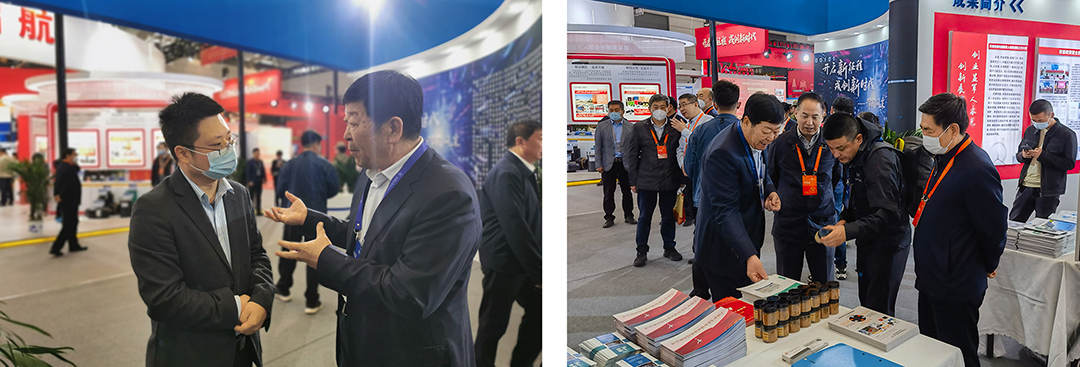 天津市退役军人事务局副局长程建国及相关领导与崔洪金在天津展区进行交流